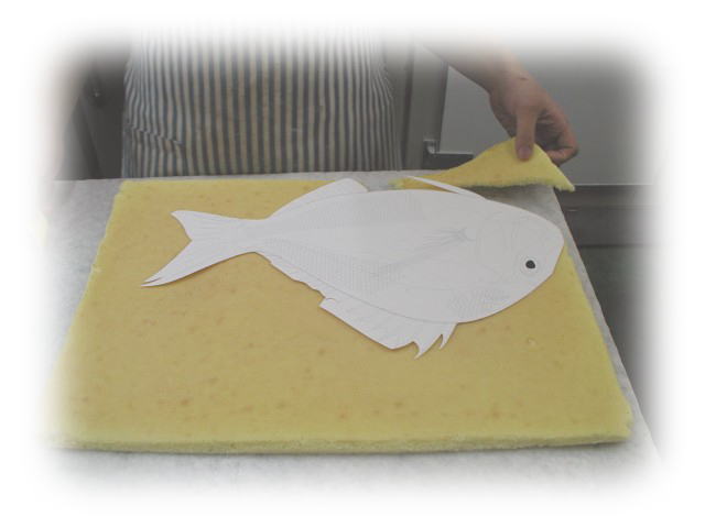 しっとりとスポンジシートを焼き上げ、型紙を当て型を切り抜きます。これを4枚用意します。