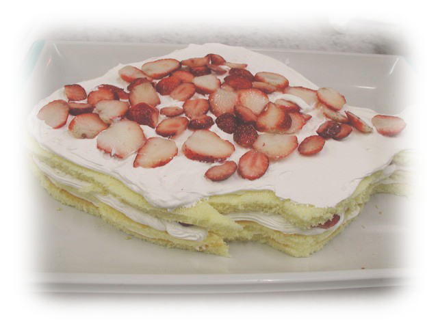 さらにスポンジを重ね、生クリームとイチゴで層を重ねます。 |