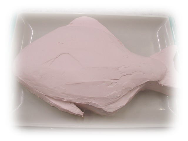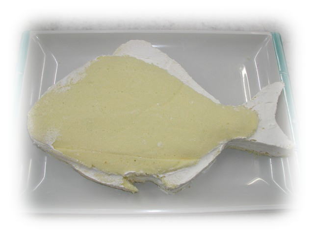 一番上のスポンジはヒレの部分を切り取り重ねます。これで土台部分は完成です。